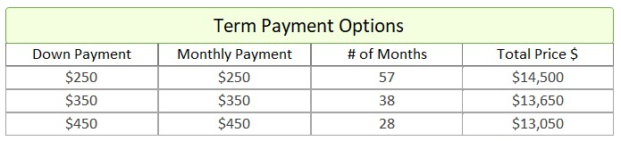 - Term Option 1: $250 down, $250 for 57 months, for a total price of $14,500