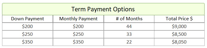 - Term Option 1: $200 down, $200 for 44 months, for a total price of $9,000