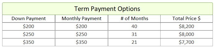 - Term Option 2: $250 down, $250 for 31 months, for a total price of $8,000
