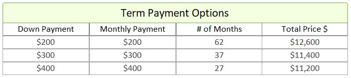 - Term Option 1: $200 down, $200 for 62 months, for a total price of $12,600