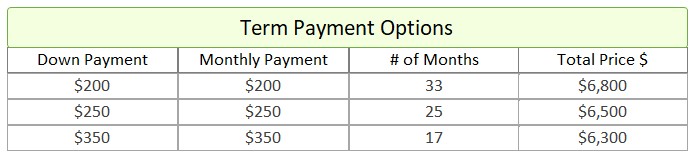 - Term Option 1: $200 down, $200 for 33 months, for a total price of $6,800