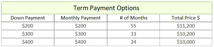 - Term Option 3: $400 down, $400 for 24 months, for a total price of $10,000