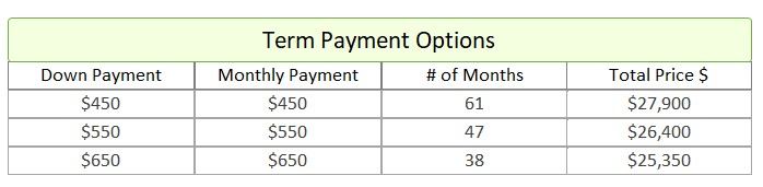 - Term Option 3: $650 down, $650 for 38 months, for a total price of $25,350