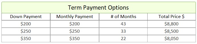 - Term Option 1: $200 down, $200 for 43 months, for a total price of $8,800