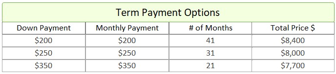 - Term Option 2: $250 down, $250 for 31 months, for a total price of $8,000