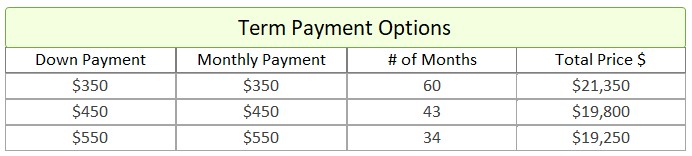 • Term Option 2: $450 down, $450 for 43 months, for a total price of $19,800