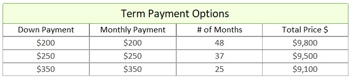 - Term Option 3: $350 down, $350 for 25 months, for a total price of $9,100