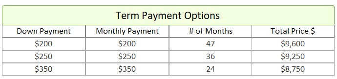 - Term Option 3: $350 down, $350 for 24 months, for a total price of $8,750