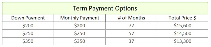 • Term Option 1: $200 down, $200 for 77 months, for a total price of $15,600