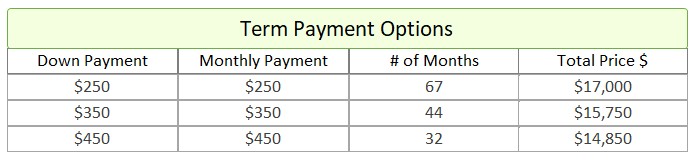 • Term Option 1: $250 down, $250 for 67 months, for a total price of $17,000