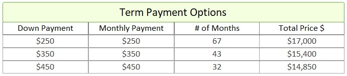 - Term Option 1: $250 down, $250 for 67 months, for a total price of $17,000
