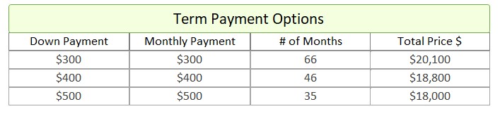 - Term Option 1: $300 down, $300 for 66 months, for a total price of $20,100