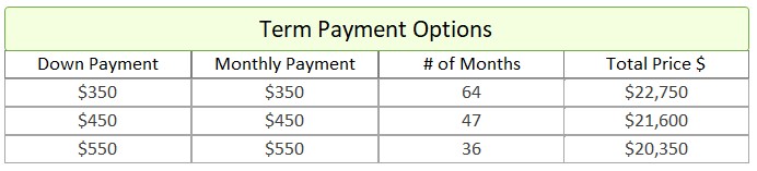 - Term Option 2: $450 down, $450 for 47 months, for a total price of $21,600