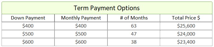 - Term Option 1: $400 down, $400 for 63 months, for a total price of $25,600