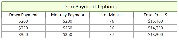 • Term Option 1: $200 down, $200 for 76 months, for a total price of $15,400