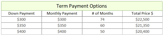 - Term Option 1: $300 down, $300 for 74 months, for a total price of $22,500