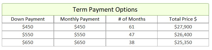 • Term Option 3: $650 down, $650 for 38 months, for a total price of $25,350