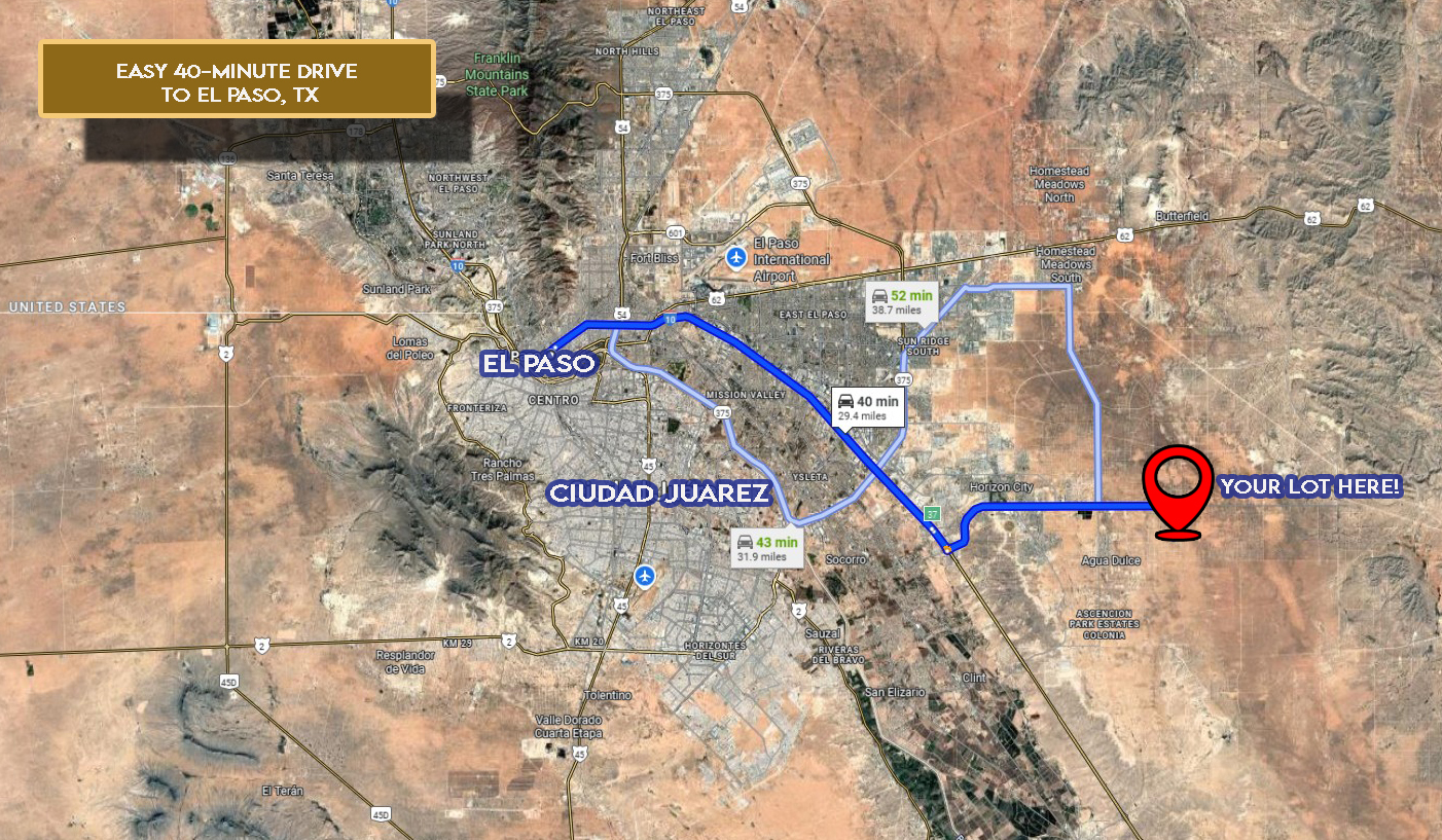 This unrestricted property gives you the freedom to create the lifestyle you want. RV living is welcome, and you can build a site-built, mobile, or manufactured home on this spacious lot. Located approximately 40 minutes via I-10 from downtown El Paso, you’ll enjoy peaceful surroundings while staying close to shopping, dining, and entertainment in the city.At 0.83 acres, this property offers extra room for a homestead, recreation, or future expansion. The land is flat, with power available at the road, making it easy to develop. Situated in Horizon City Subdivision of El Paso County, Texas, the area is benefiting from regional growth and major investments in aerospace and manufacturing that are creating jobs and boosting property values.