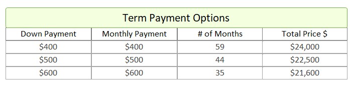 - Term Option 1: $400 down, $400 for 59 months, for a total price of $24,000