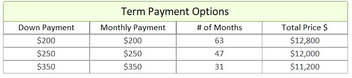 - Term Option 1: $200 down, $200 for 63 months, for a total price of $12,800