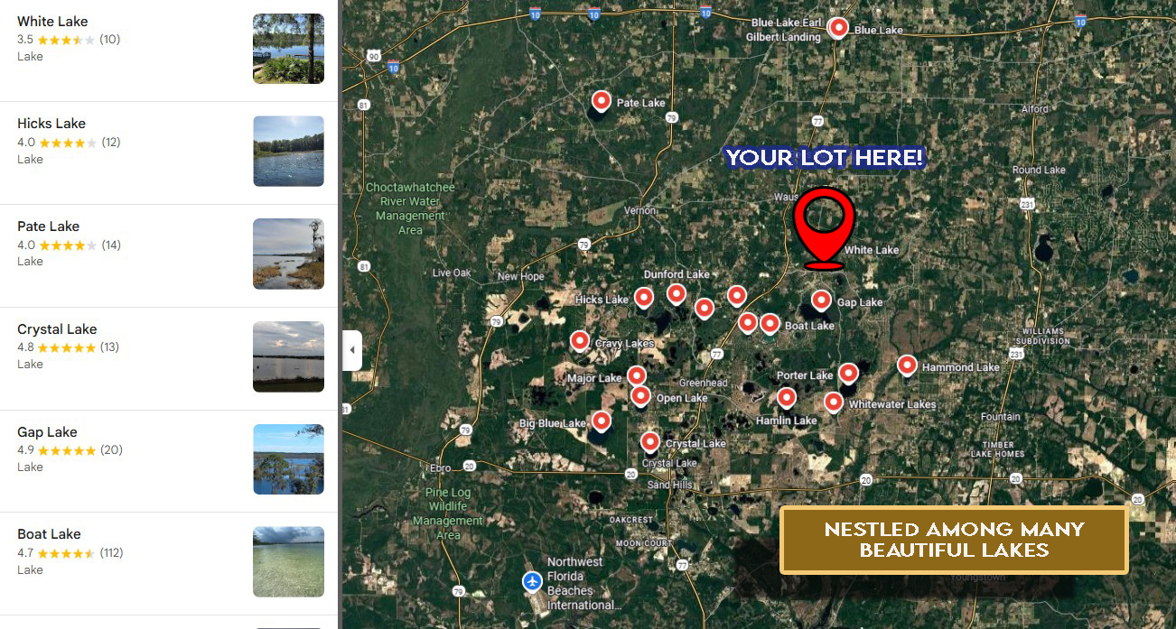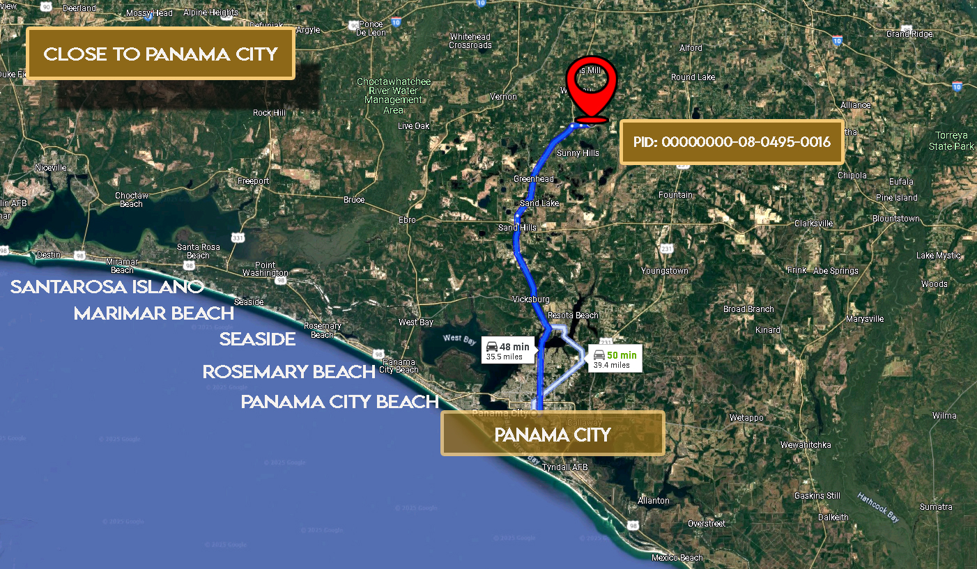 Situated in Washington County, Florida, the lot features flat terrain at an elevation of 270′, with power available at the street. Water and sewer vary by area, so buyers should verify with Sunny Hills. The property is residential-zoned and part of a voluntary POA with no annual fees, providing both flexibility and peace of mind. Located approximately 50 minutes via FL-77 S E to Panama City, this location combines serene surroundings with accessibility to major city amenities.