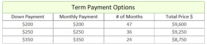 • Term Option 2: $250 down, $250 for 36 months, for a total price of $9,250