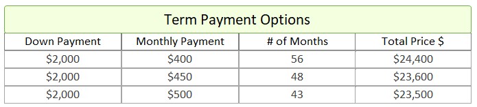 - Term Option 1: $2,000 down, $400 for 56 months, for a total price of $24,400