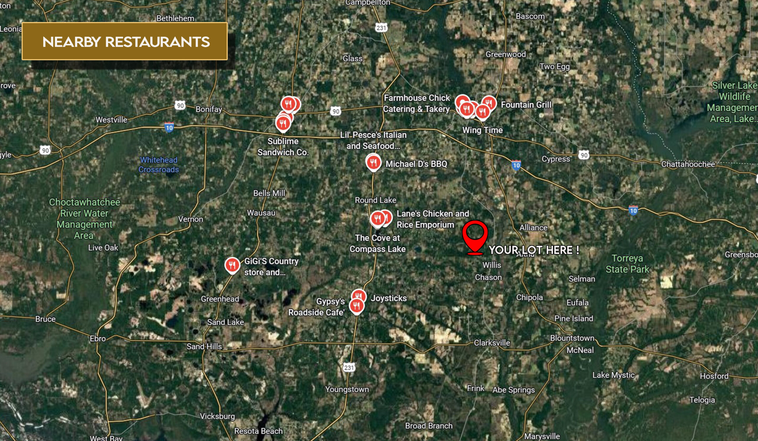 - GPS Coordinates (center) at the road: 30.6295, -85.3438