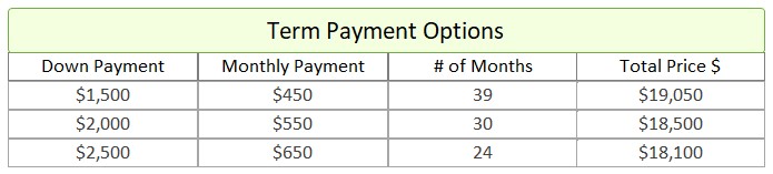 - Term Option 1: $1,500 down, $450 for 39 months, for a total price of $19,050