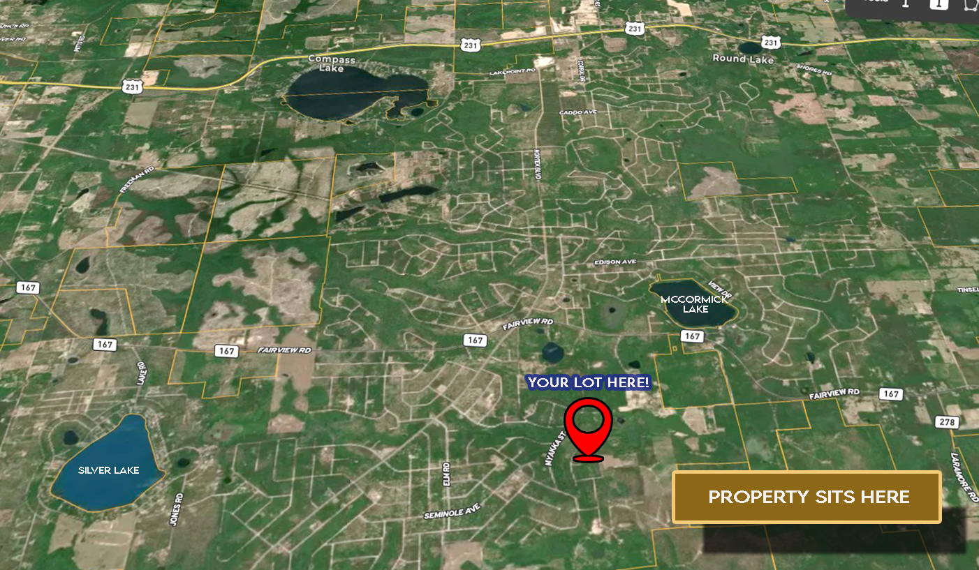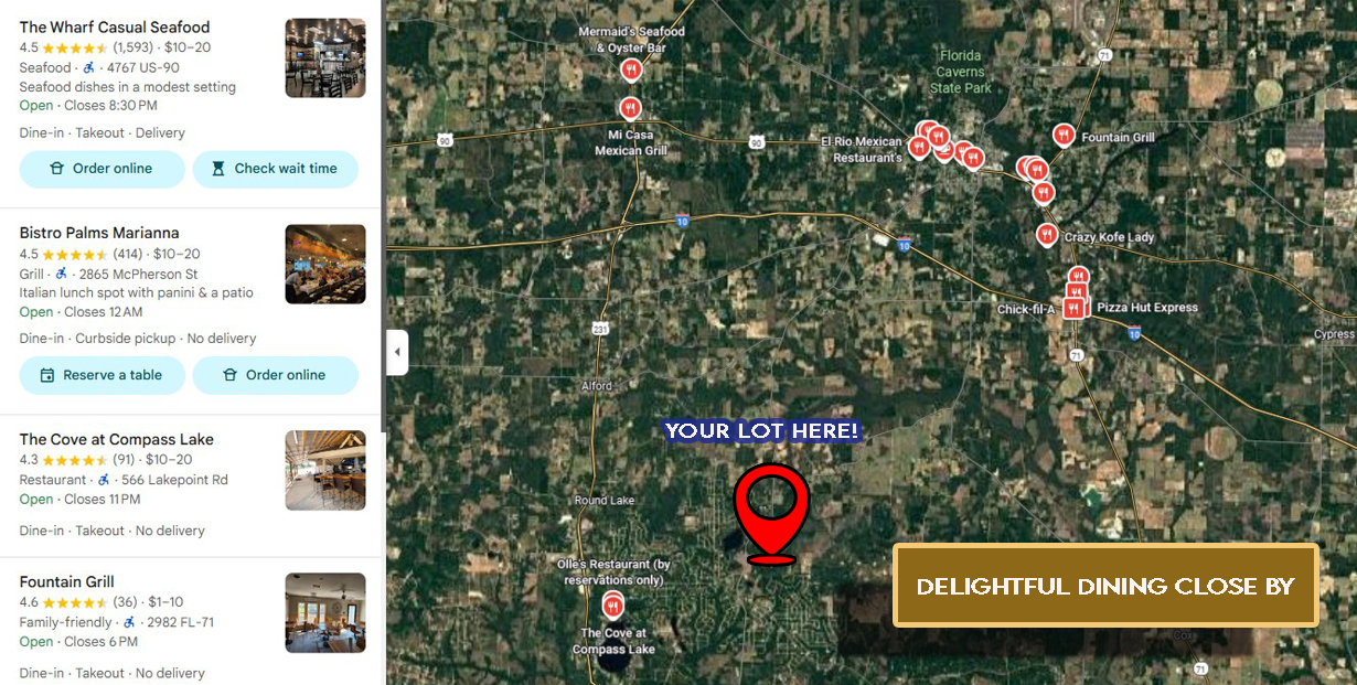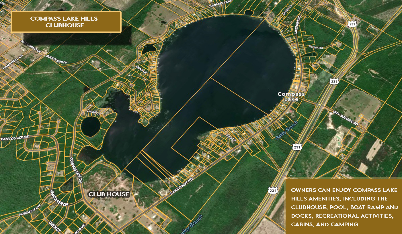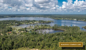 Owners can take advantage of a wide array of community amenities, including the Compass Lake boat ramp, dock with slip rentals, swimming pool, clubhouse, picnic pavilions, kayak and fishing gear rentals, disc golf course, and a driving range. Additional recreation is available at McCormick Lake, only 11 minutes away. Guests and overnight visitors are welcome at cabins, RV sites, or tent camping with power and water hookups.