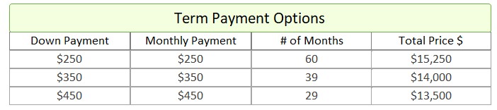 - Term Option 1: $250 down, $250 for 60 months, for a total price of $15,250