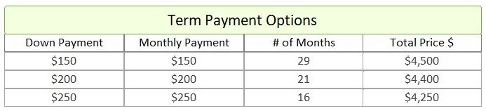• Term Option 3: $250 down, $250 for 16 months, for a total price of $4,250
