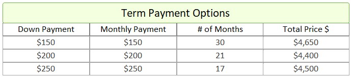 - Term Option 1: $150 down, $150 for 30 months, for a total price of $4,650