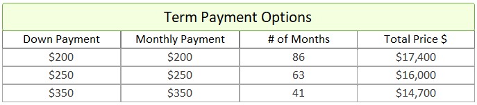 • Term Option 1: $200 down, $200 for 86 months, for a total price of $17,400