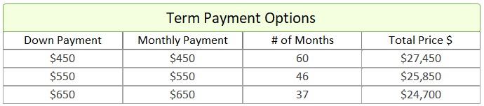 - Term Option 1: $450 down, $450 for 60 months, for a total price of $27,450