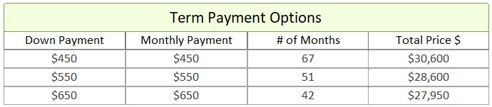 - Term Option 1: $450 down, $450 for 67 months, for a total price of $30,600