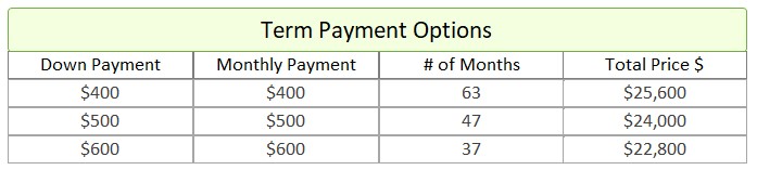 - Term Option 1: $400 down, $400 for 63 months, for a total price of $25,600