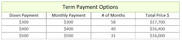 - Term Option 3: $500 down, $500 for 31 months, for a total price of $16,000