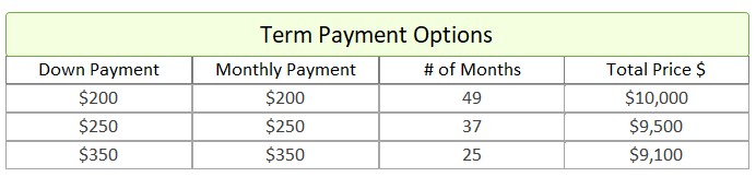 - Term Option 1: $200 down, $200 for 49 months, for a total price of $10,000