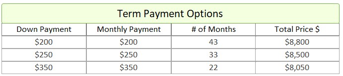 - Term Option 1: $200 down, $200 for 43 months, for a total price of $8,800