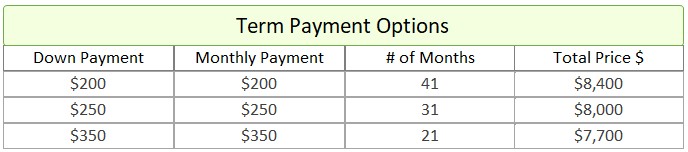 • Term Option 2: $250 down, $250 for 31 months, for a total price of $8,000