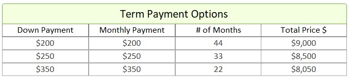 • Term Option 2: $250 down, $250 for 33 months, for a total price of $8,500