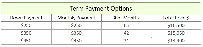 - Term Option 1: $250 down, $250 for 65 months, for a total price of $16,500