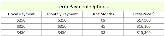 - Term Option 1: $250 down, $250 for 69 months, for a total price of $17,500
