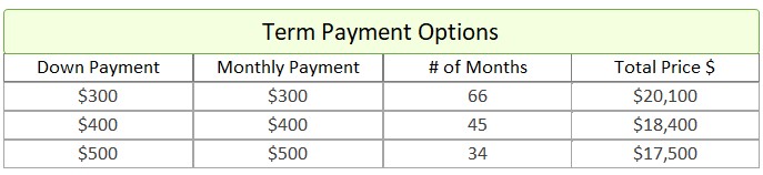 - Term Option 1: $300 down, $300 for 66 months, for a total price of $20,100