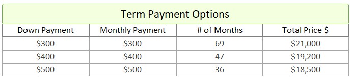 - Term Option 1: $300 down, $300 for 69 months, for a total price of $21,000
