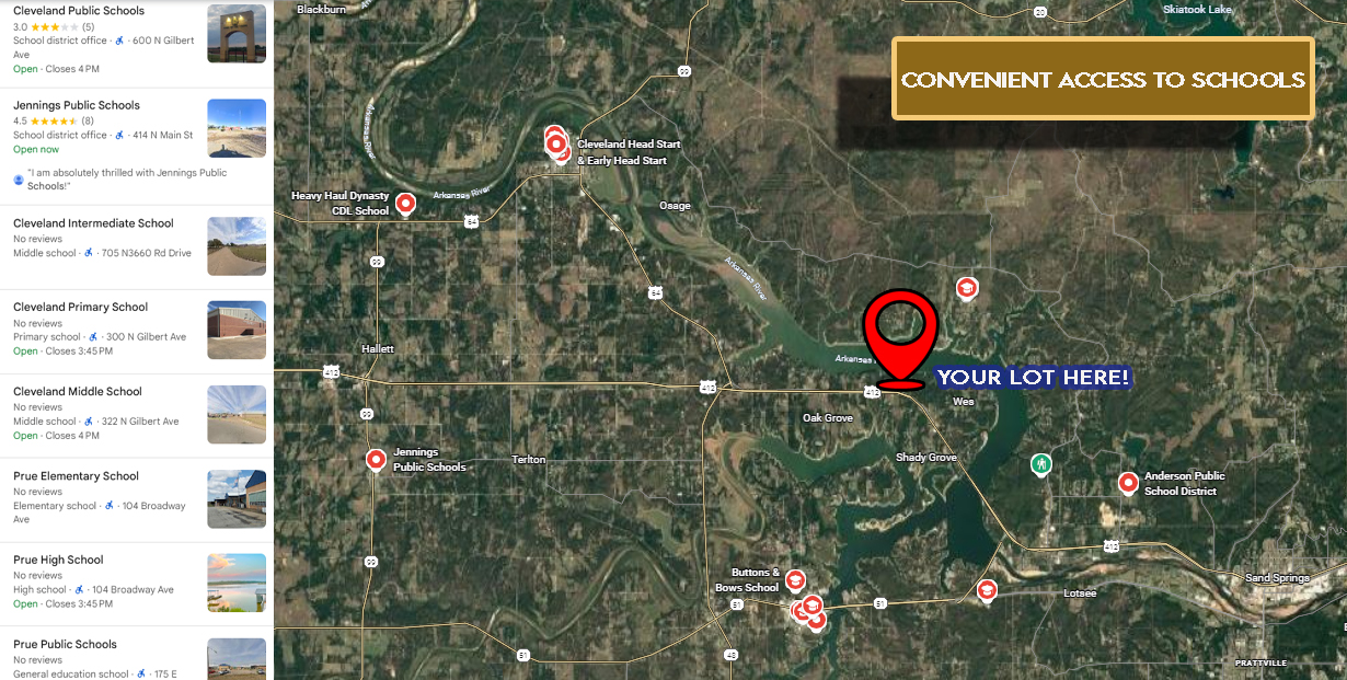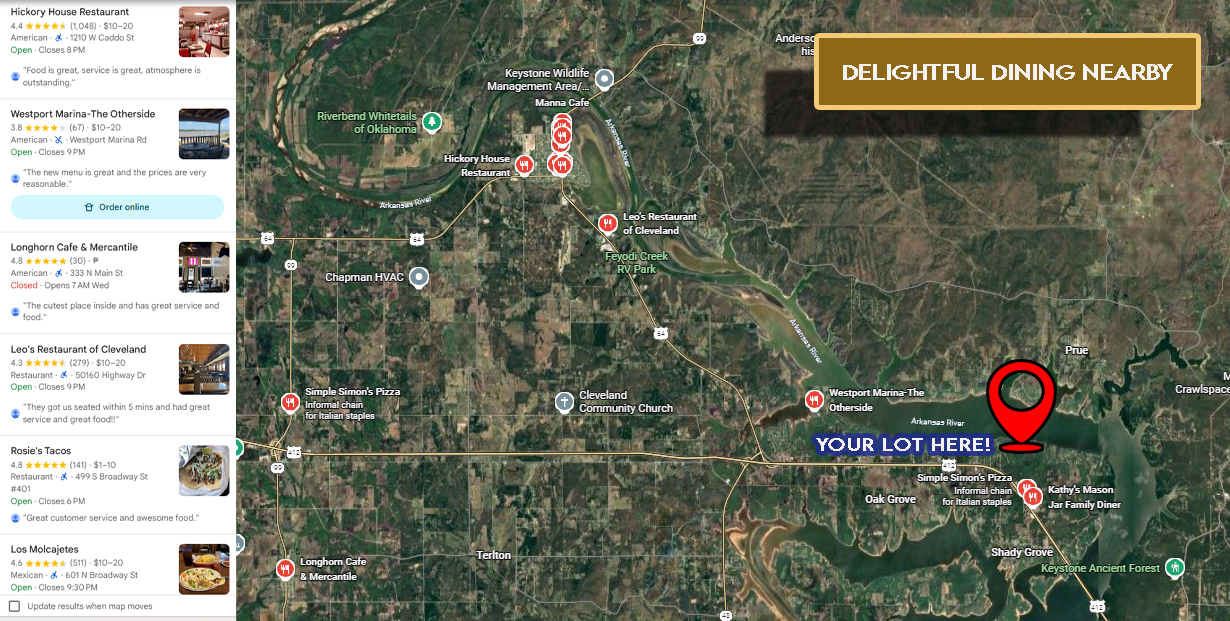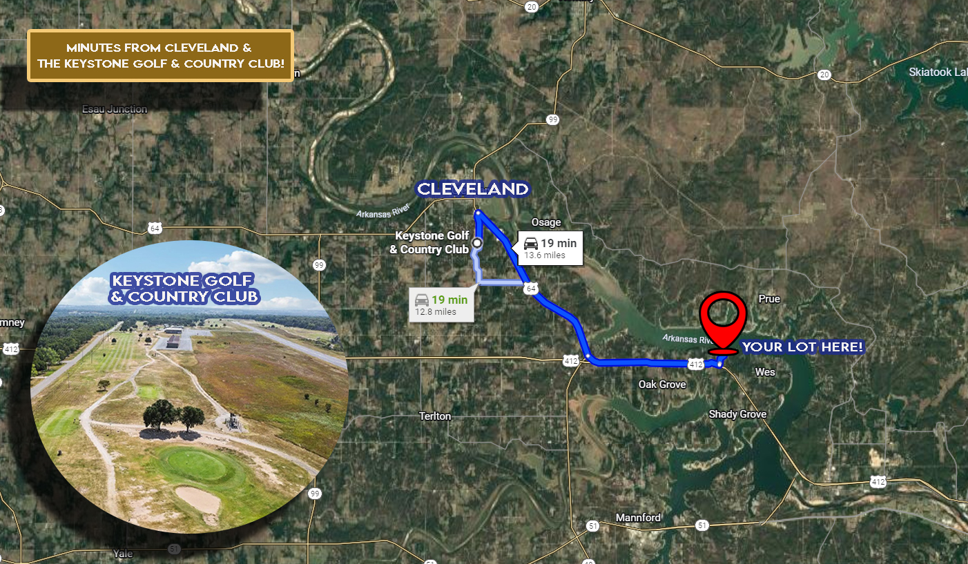 Spend your days boating, fishing, or relaxing by the lake, while still being only about 10 minutes via local roads to Cleveland, Oklahoma, close to shopping, dining, and everyday conveniences. RV enthusiasts will appreciate the nearby parks, including Cimarron Bend, Sandy Point, Edgewater, and The RV Park, all just minutes away.
