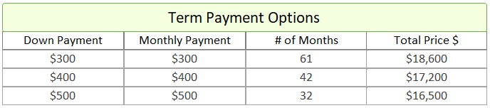 - Term Option 3: $500 down, $500 for 32 months, for a total price of $16,500