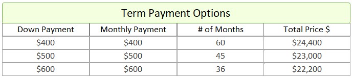 - Term Option 1: $400 down, $400 for 60 months, for a total price of $24,400