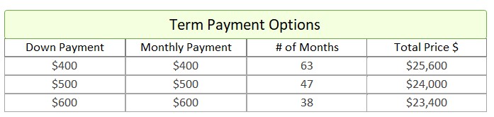- Term Option 1: $400 down, $400 for 63 months, for a total price of $25,600